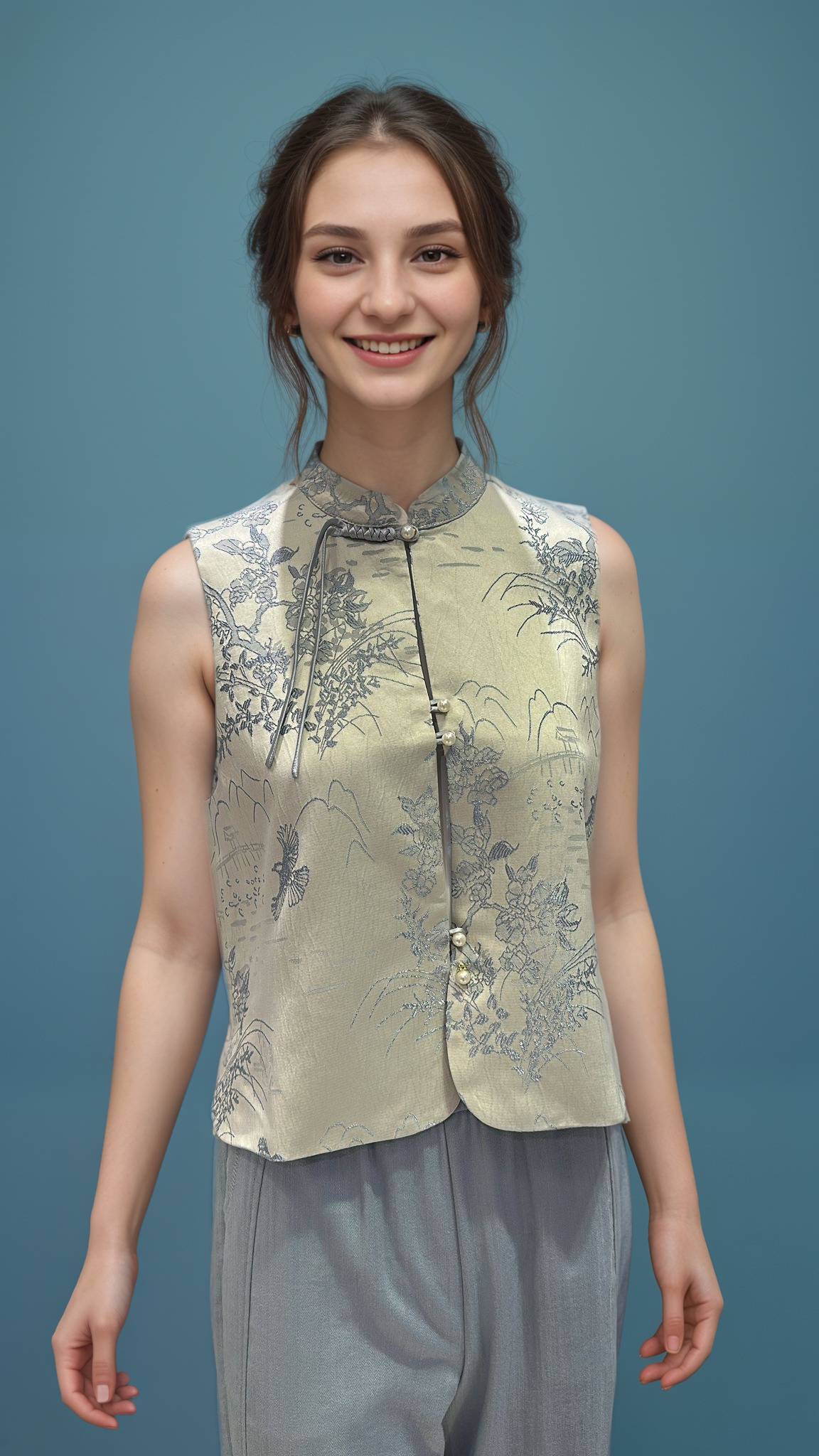 Our NEW Oriental Brocade Vest. Wear it layered with a camisole or a short sleeve blouse.