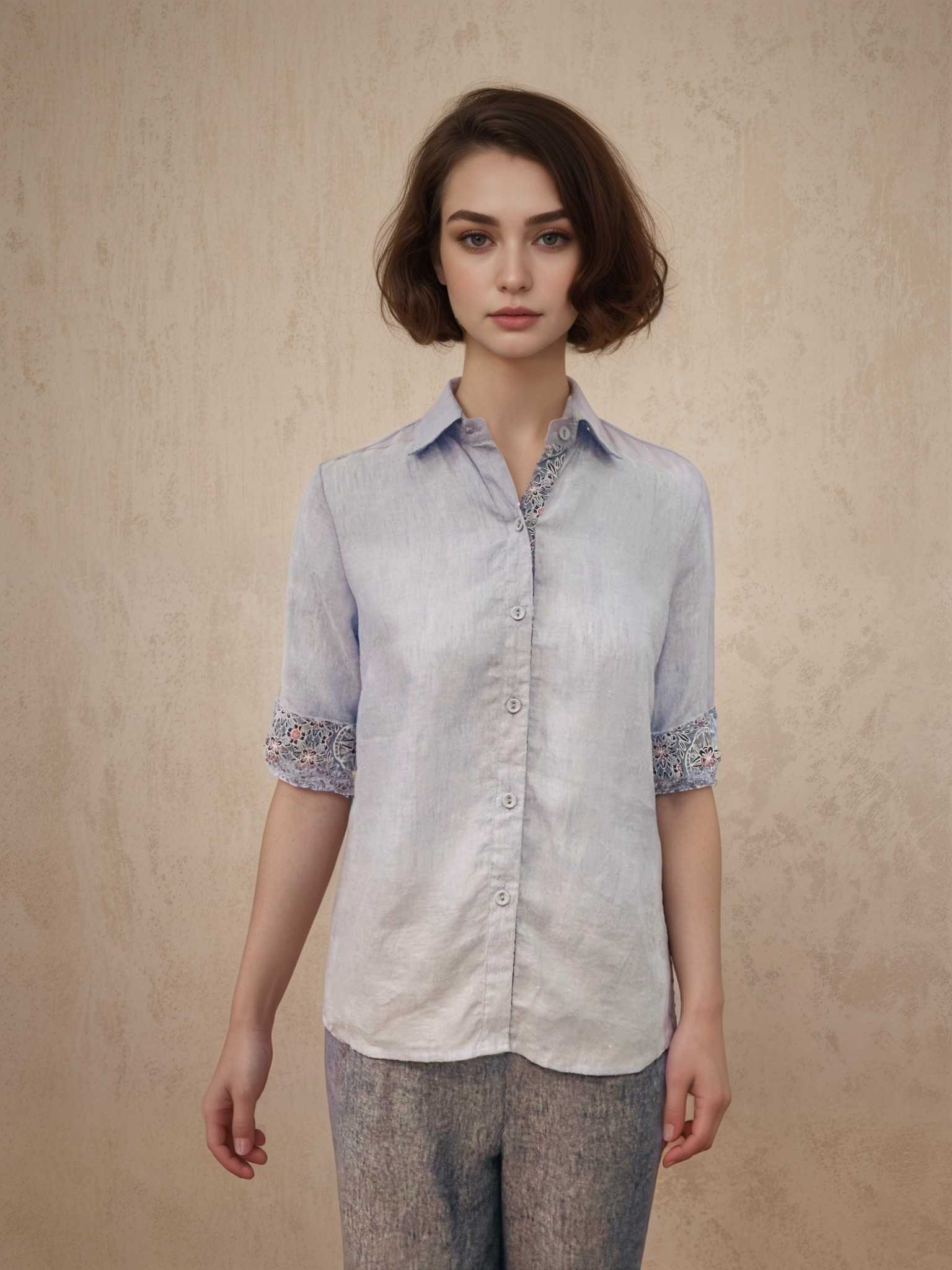 Shirt with detail trimmings at collar and sleeves.