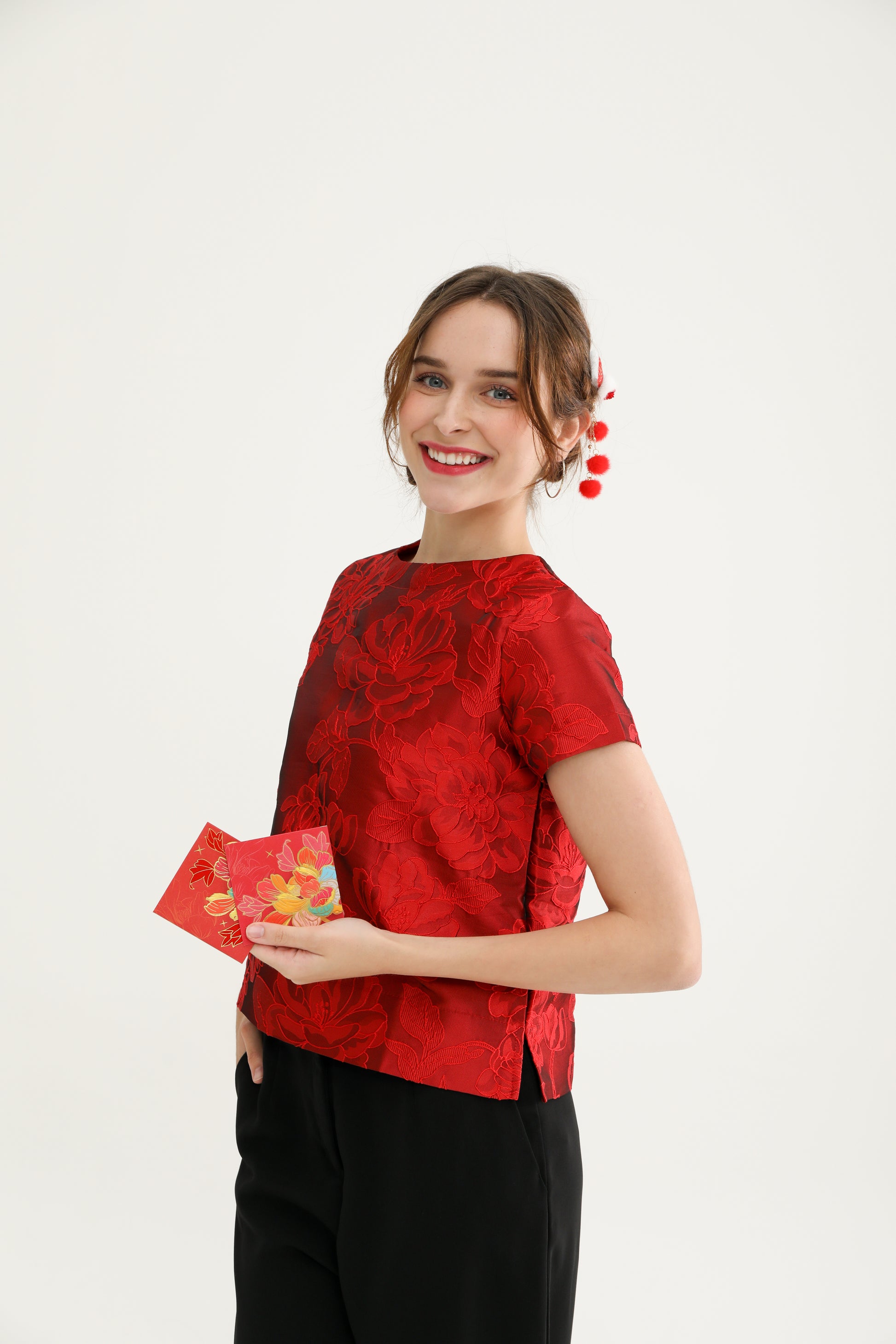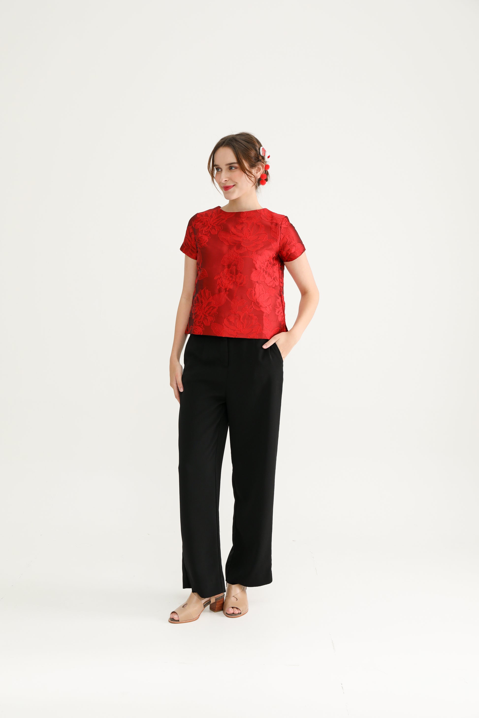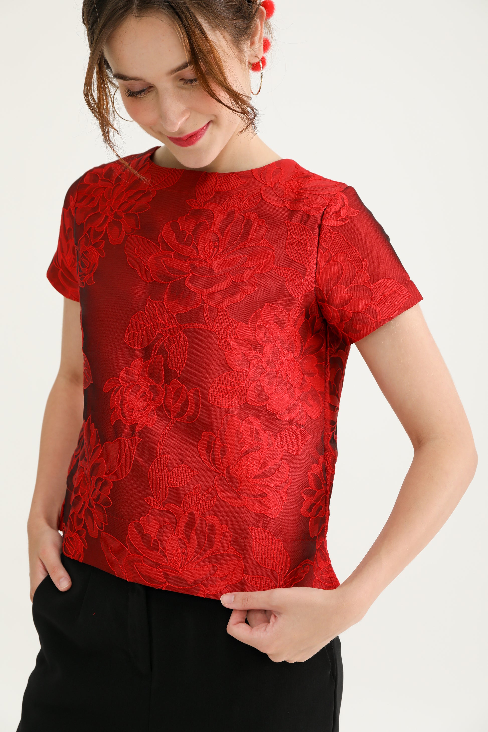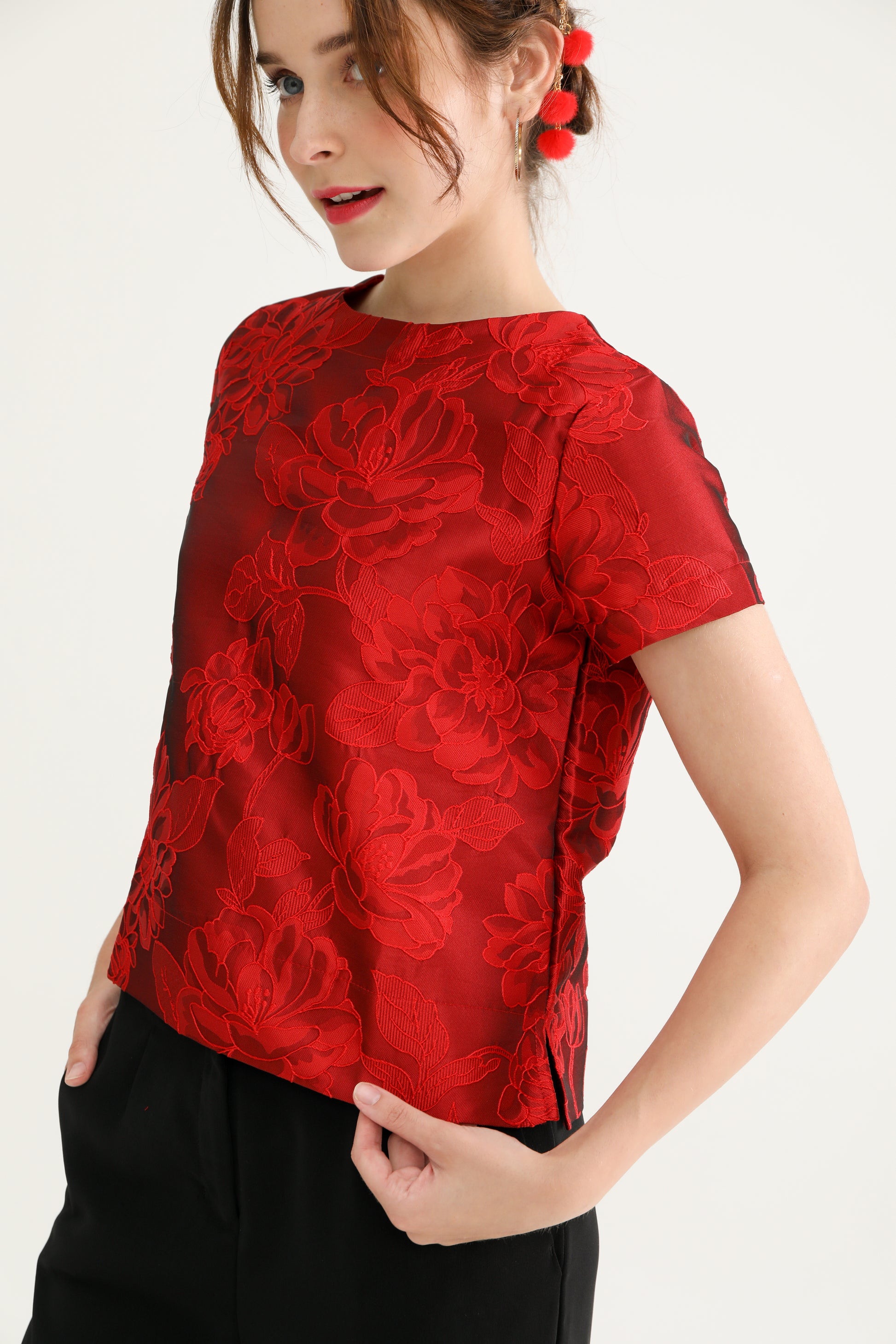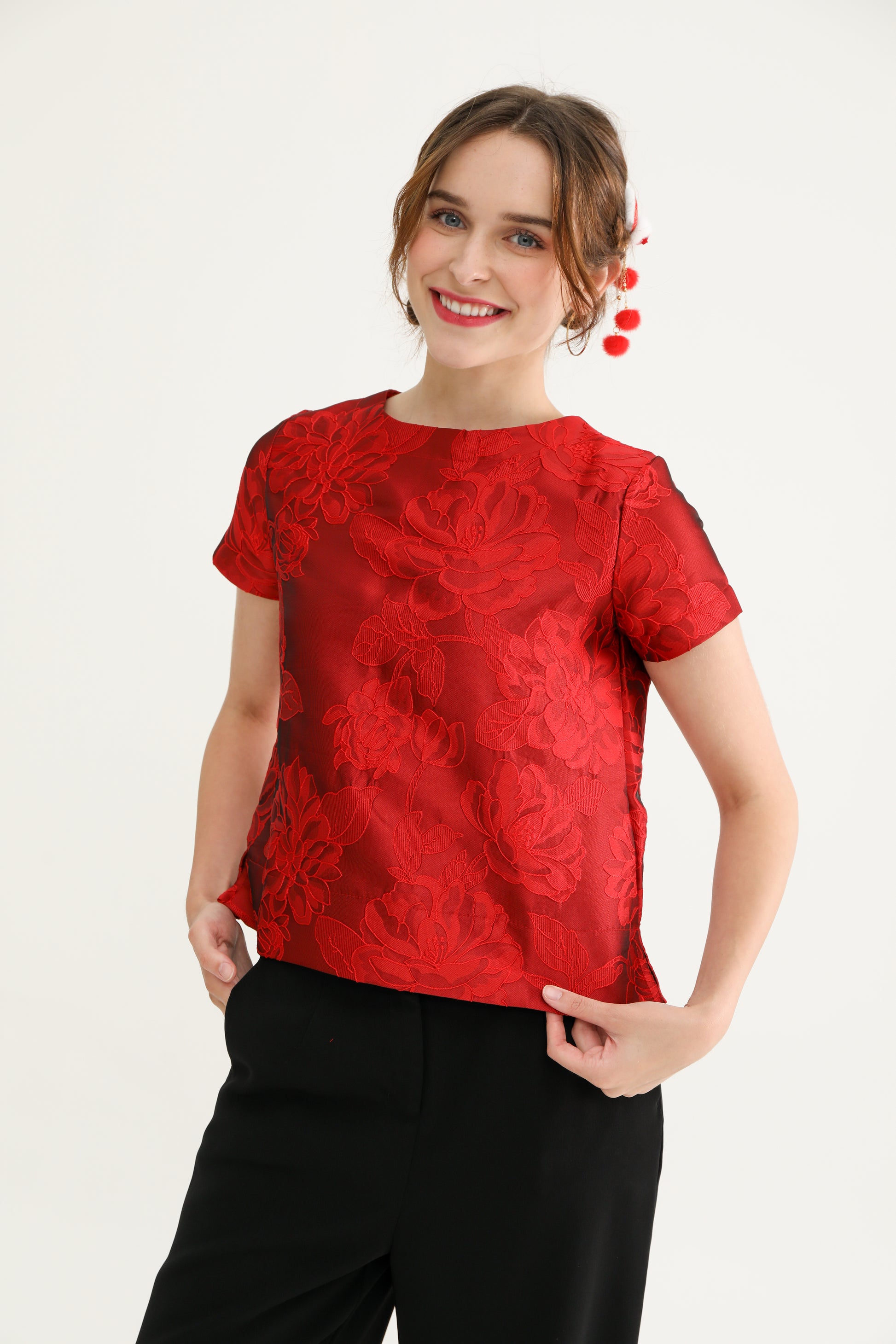 A simple round neck classic style blouse design with Emboss Rose fabric.l