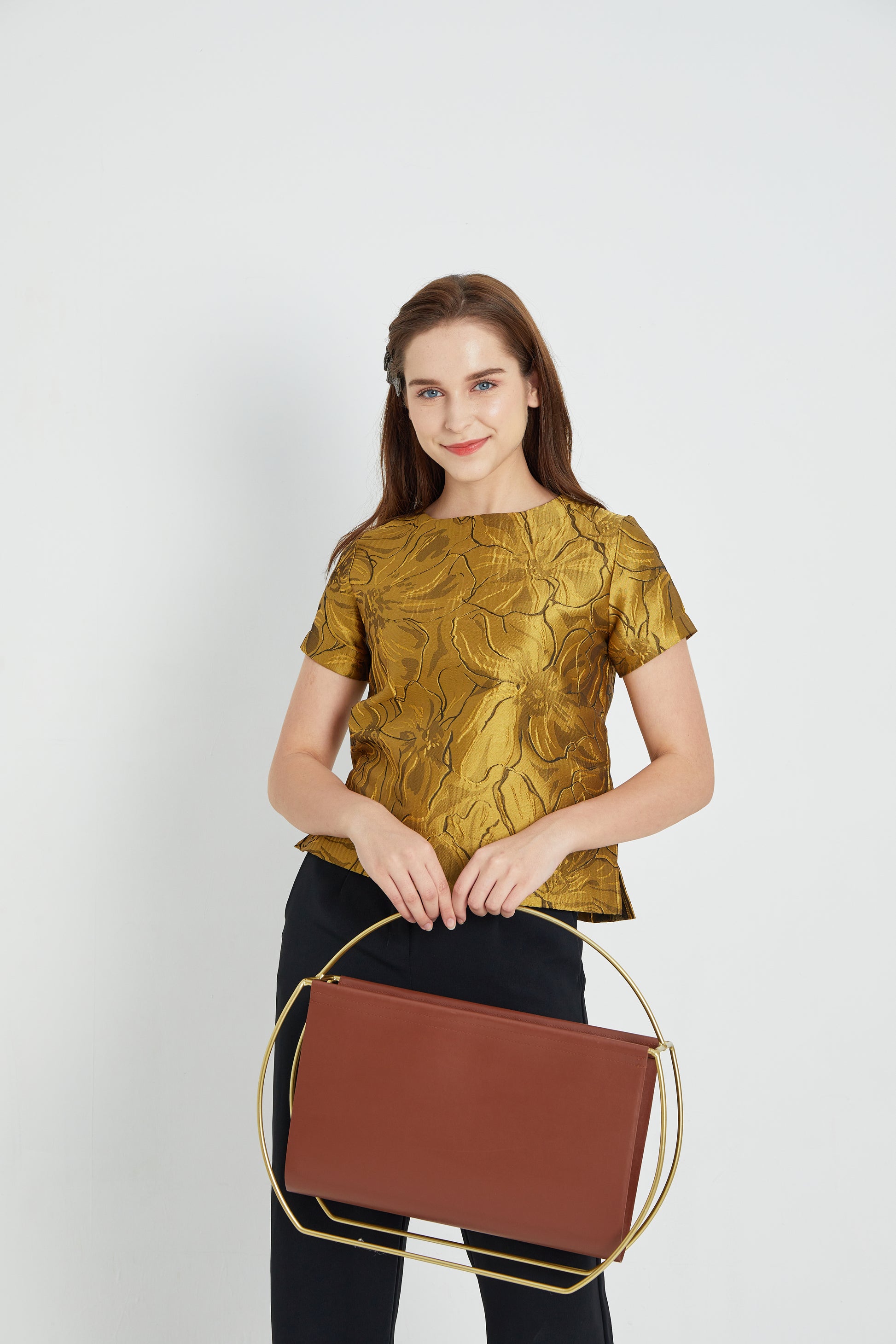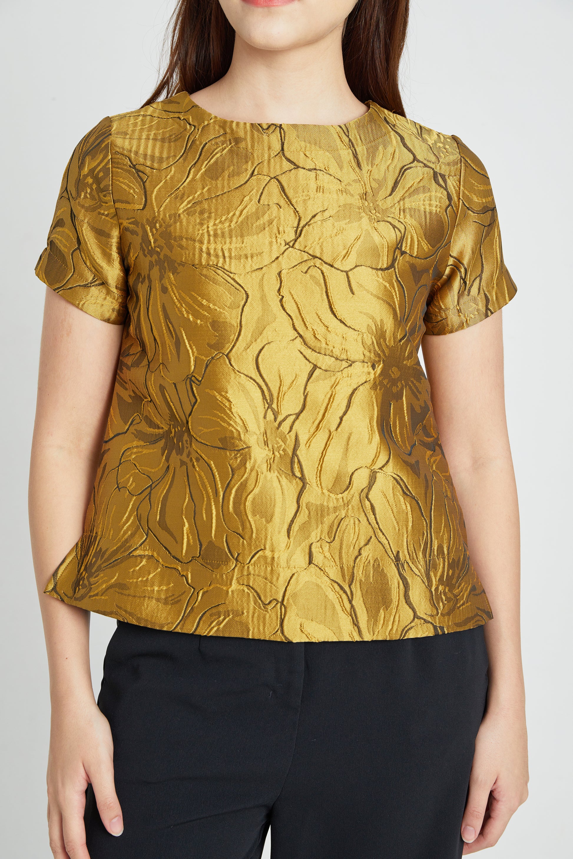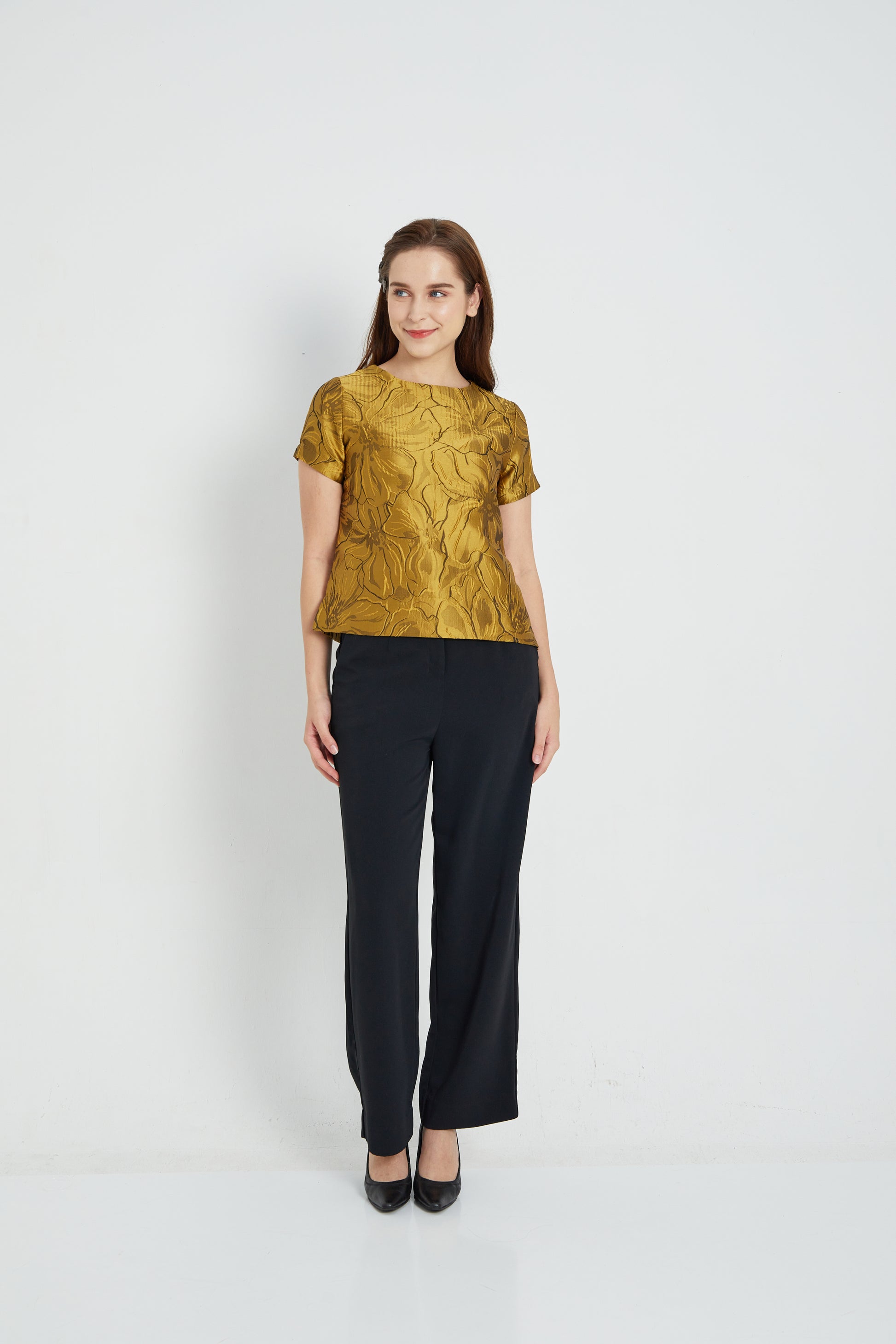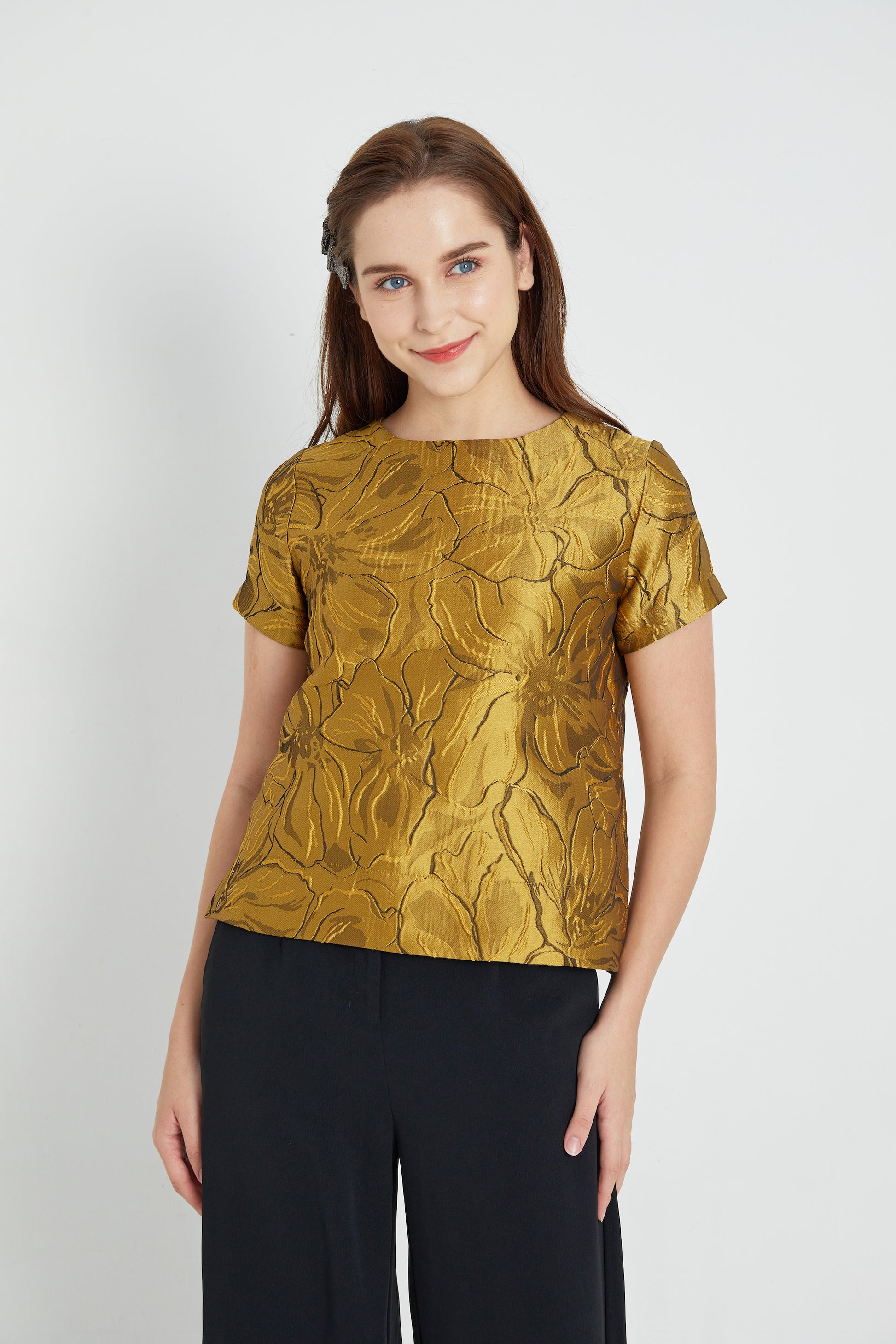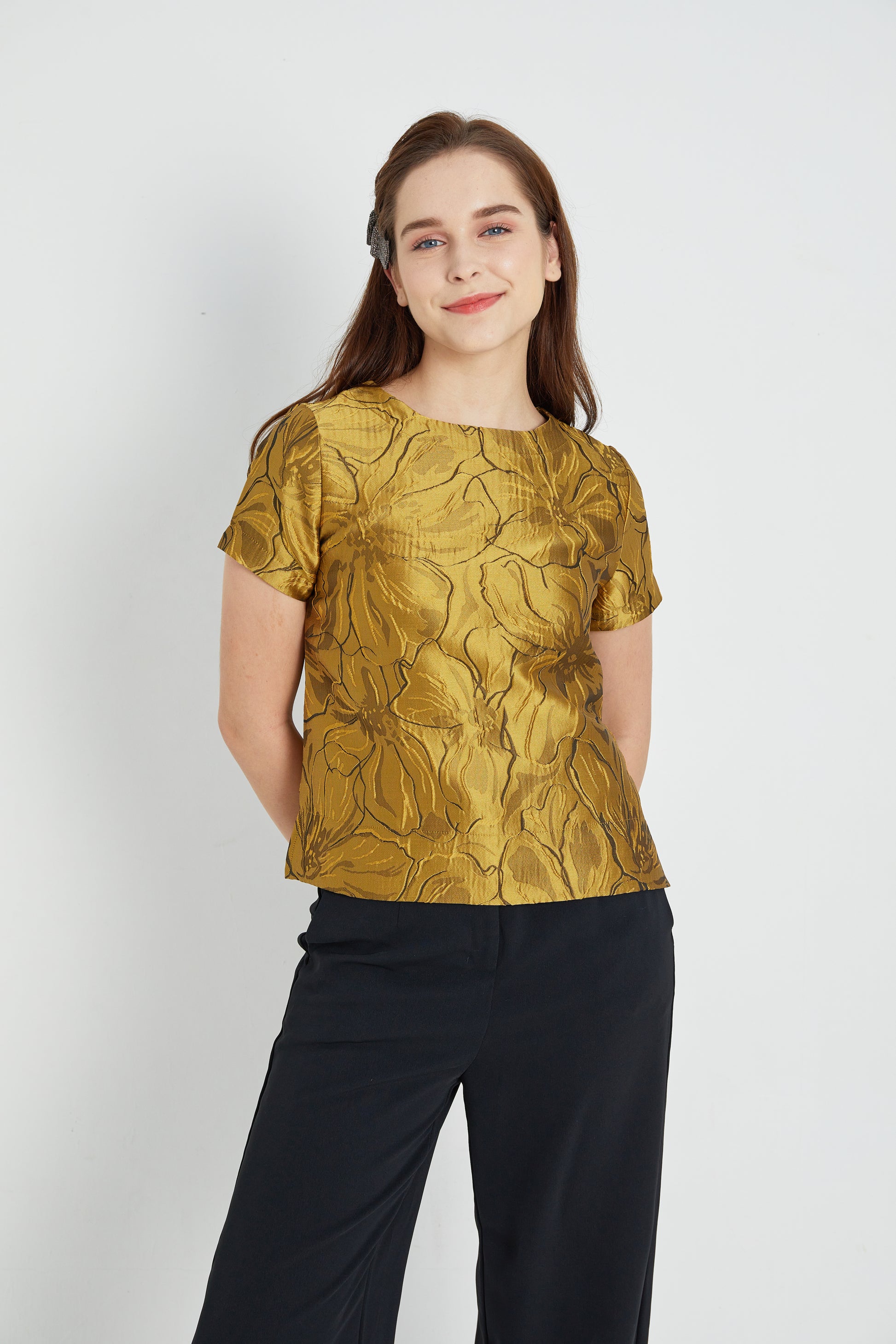 A simple round neck classic styled blouse design with Emboss Flowers material