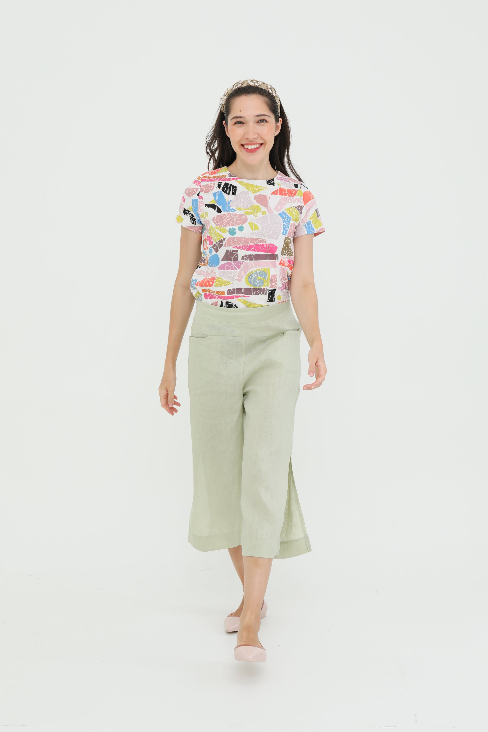 A causal loose-cut 3/4 culottes pant with slit.